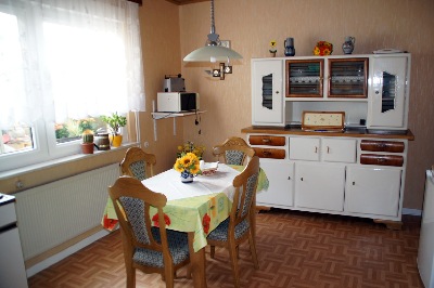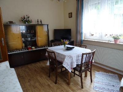 Wohnzimmer: großer Esstisch, Couch mit 2 Sesseln, LCD-Fernseher (80 cm), digitale Sat-Anlage, Radio, gut bestücktes Bücherregal.