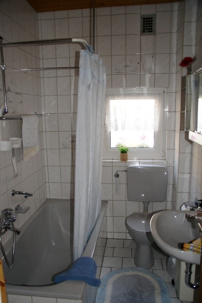 Bad: Badewanne mit Duschvorrichtung, Toilette und Waschbecken. Haartrockner vorhanden