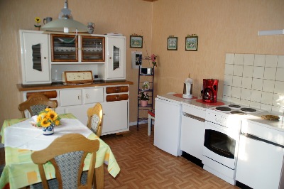 Große Wohnküche: E-Herd, Backofen, Kühlschrank, Mikrowelle, Kaffemaschine, Geschirr, Gläser und vieles mehr.